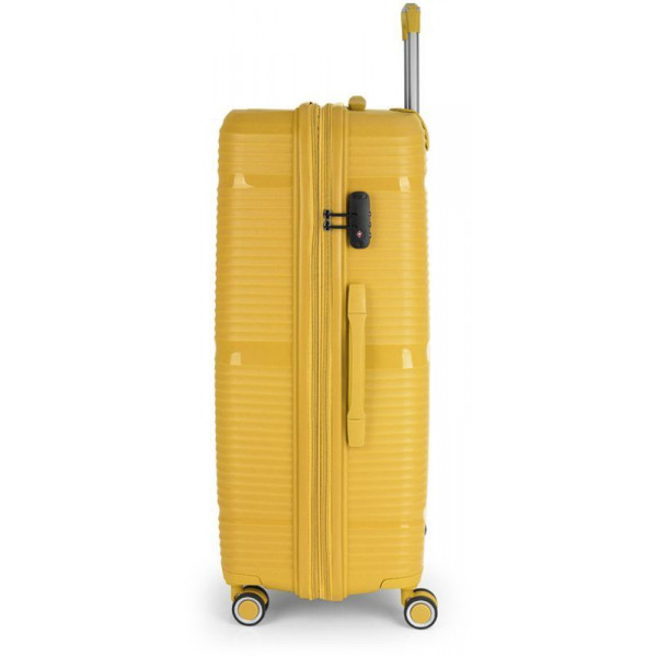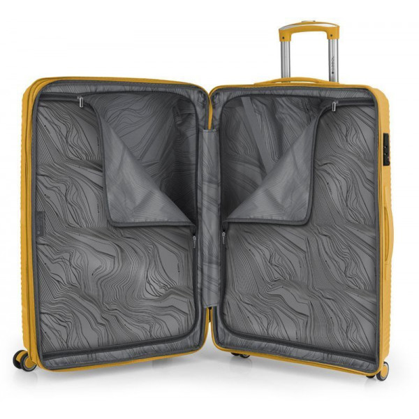 Валіза Gabol Akane (L) Mustard (122447-027) оснащена чотирма здвоєними колесами з можливістю незалежного розвороту на 360°. Конструкцією передбачений рівномірний розподіл навантаження на кожне колесо, що в свою чергу сприяє плавному руху та маневреності валізи, докладаючи при цьому мінімум зусиль. Колеса виготовлені з високотемпературного термопластичного поліуретану (TPU). Даний матеріал має міцність порівнянну з пластиком, гнучкість силікону, а також підвищену стійкість до перепадів температури. Відмінною особливістю коліс із TPU є зниження шуму до мінімуму під час руху валізи. Завдяки стійкості до стирання, матеріал коліс відрізняється тривалим терміном експлуатації.