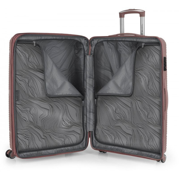 Корпус валіз Gabol серії Akane виконаний із міцного та довговічного матеріалу - поліпропілену, що дуже важливо для валіз, які перевозяться в багажних відділеннях. Внутрішній простір розділений перегородкою на два відділення з ременями для фіксації речей усередині. Модель має функцію розширення, що дозволяє за необхідності збільшити об'єм валізи до 124 літрів.