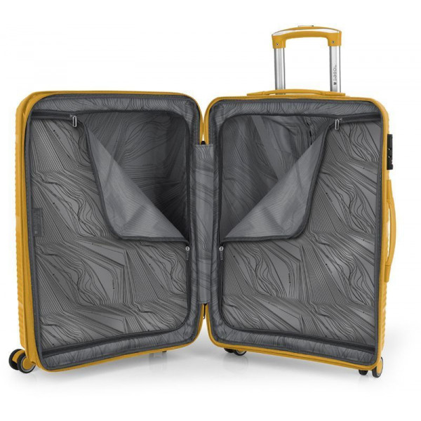 Корпус валіз Gabol серії Akane виконаний із міцного та довговічного матеріалу - поліпропілену, що дуже важливо для валіз, які перевозяться в багажних відділеннях. Внутрішній простір розділений перегородкою на два відділення з ременями для фіксації речей усередині. Модель має функцію розширення, що дозволяє за необхідності збільшити об'єм валізи до 89 літрів.