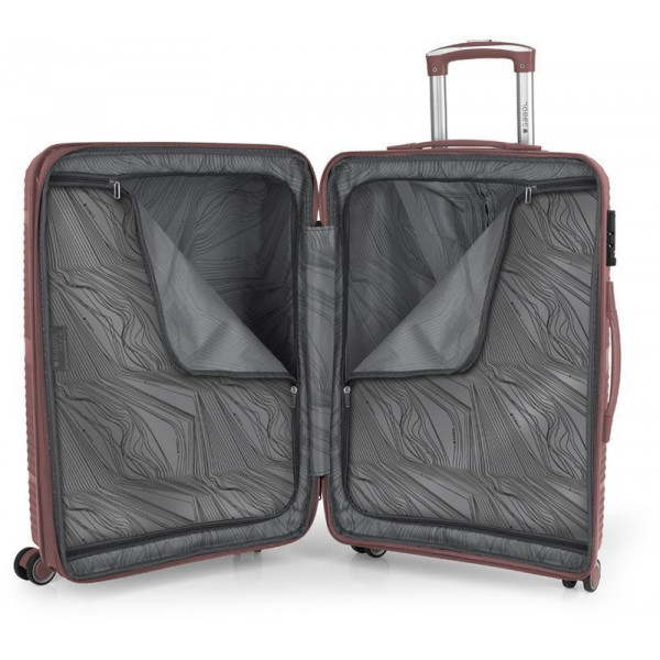 Корпус валіз Gabol серії Akane виконаний із міцного та довговічного матеріалу - поліпропілену, що дуже важливо для валіз, які перевозяться в багажних відділеннях. Внутрішній простір розділений перегородкою на два відділення з ременями для фіксації речей усередині. Модель має функцію розширення, що дозволяє за необхідності збільшити об'єм валізи до 89 літрів.