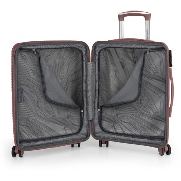 Корпус валіз Gabol серії Akane виконаний із міцного та довговічного матеріалу - поліпропілену, що дуже важливо для валіз, які перевозяться в багажних відділеннях. Внутрішній простір розділений перегородкою на два відділення з ременями для фіксації речей усередині. Модель має функцію розширення, що дозволяє за необхідності збільшити об'єм валізи до 41 літра.