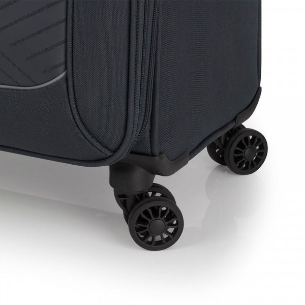 Валіза оснащена чотирма здвоєними повноповоротними колесами з можливістю незалежного розвороту кожного колеса на 360°. Системою передбачено рівномірний перерозподіл навантаження на кожне колесо, що у свою чергу сприяє плавному руху та маневреності валізи, докладаючи при цьому мінімум зусиль. Колеса виготовлені із високотемпературного термопластичного поліуретану (TPU). Матеріал має міцність порівнянну з пластиком, гнучкістю силікону, а також має підвищену стійкість до перепадів температур. Відмінною особливістю коліс із TPU матеріалу є зниження шуму до мінімуму під час руху валізи по нерівній поверхні. Завдяки стійкості до стирання матеріал коліс відрізняється тривалим терміном експлуатації.