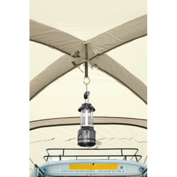 - Спосіб встановлення: внутрішній намет навішується на дуги за допомогою стрічок і застібок; зовнішній тент натягується та фіксується відтяжками