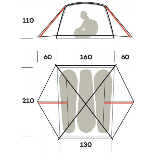 - Зовнішній тент: 70D Polyester Ripstop, 85 g/m² with Polyurethane Coating, FR Treatment (поліестер із поліуретановим покриттям та вогнезахисною обробкою), водостійкість 3000 мм