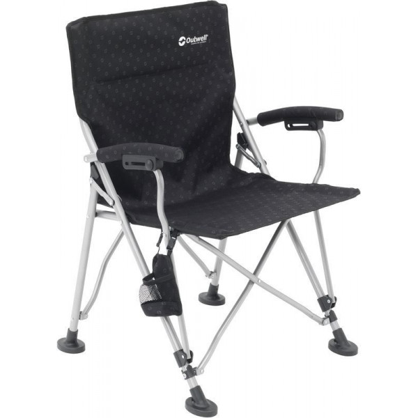 Outwell Campo Black (470233) - розкладний стілець із м'якими підлокітниками та знімним підстаканником. Каркас виготовлений із високоміцної сталі з порошковим фарбуванням та витримує навантаження до 125 кг. Збільшені опори ніжок підвищують стійкість на м'якому ґрунті. Чохол для перенесення полегшує транспортування та забезпечує компактне зберігання, коли стілець не використовується.