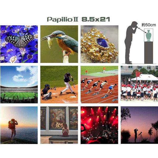 Компактний бінокль Pentax UP 8.5x21 Papilio II (62002) відповідає сучасним вимогам та стандартам: повне багатошарове просвітлення лінз, призми з високоякісного оптичного скла BaK4. Оновлене покриття лінз з покращеним світлопропусканням створює кришталево чітке зображення. Бінокль Pentax UP 8.5x21 Papilio II (62002) унікальна модель. Завдяки механізму автоматичної компенсації зміщення поля зображення правого та лівого монокулярів при фокусуванні, забезпечується унікально коротка дистанція спостереження в бінокль Papilio – лише 50 см! Бінокль серії Papilio призначений не тільки для макроспостереження з відстані 50 см, користувач також можете детально спостерігати за будинками архітектури, зоряним небом чи спортивними змаганнями. Корпус виробу має гумове покриття яке сприяє додатковому захисту від механічних пошкоджень. Модель бінокля Pentax UP 8.5x21 Papilio II (62002) призначена для використання під час подорожей, спостереження за дикою природою, тощо.