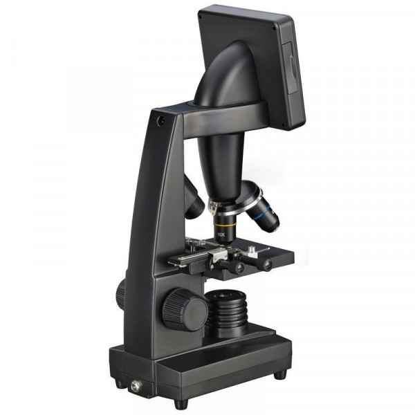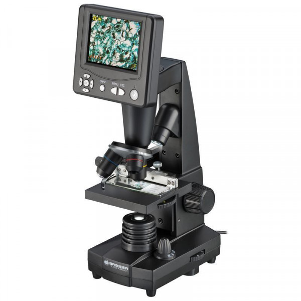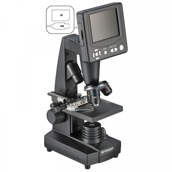 Мікроскоп Bresser Biolux LCD 50x-2000x (5201000) - це мікроскоп зі збільшенням до 2000 крат, за допомогою якого можна проводити вивчення препаратів як у прохідному, так і у відбитому світлі. Великий діапазон збільшення дозволяє використовувати прилад в самих різних областях. Мікроскоп підходить для навчання школярів і студентів-біологів, досліджень в області нумізматики або філателії, проведення робіт з мікроелектронікою. Мікроскоп комплектується трьома об'єктивами. Револьверне пристрій дозволяє швидко змінити кратність. Замість окуляра використовується цифрова камера 5 Мпікс з максимальною роздільною здатністю 3264x2448 пікс. Bresser LCD 50x-2000x - потужний мікроскоп: збільшення 2000 крат досягається за допомогою 4-кратного цифрового зума, оптичне збільшення знаходиться в діапазоні від 50 до 500 крат. Зображення виводиться на кольоровий РК-екран з діагоналлю 3,5 ", завдяки чому мікроскоп зручно використовувати при групових роботах. Крім того, збільшене зображення мікропрепарату можна зберегти в фото- або відеоформатах. На бічній стороні екрані є слот для карт пам'яті. Предметний столик з ноніусом і препаратоводієм дозволяє переміщати об'єкт, що вивчається, не торкаючись до нього руками. Підсвічування здійснюється за допомогою світлодіодів. Нижнє підсвічування використовується для вивчення прозорих об'єктів, а верхня призначена для дослідження непрозорих об'єктів у відбитому світлі. Під предметним столиком розташований диск з 6 світлофільтрами. Мікроскоп Bresser Biolux LCD 50x-2000x (5201000) має багату комплектацію, що робить його незамінним для початківців біологів. У комплект входять не тільки необхідні для роботи аксесуари, але і набір готових мікропрепаратів.