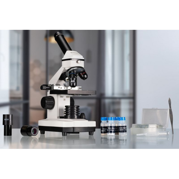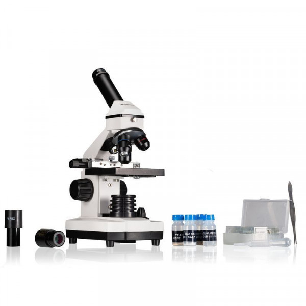 Дана модель поставляється з широким набором аксесуарів, об'єктивів і окулярів, необхідних для старту спостережень, що дає можливість відразу зануритися в такий цікавий мікросвіт. Зручний та легкий пластиковий кейс призначений для зберігання та транспортування мікроскопа та аксесуарів та приладдя.