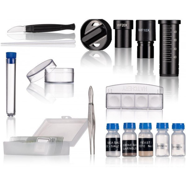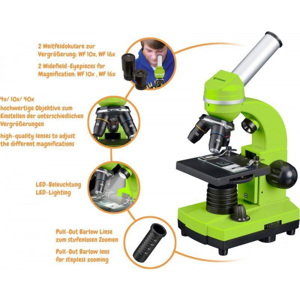 Максимум збільшення і нові яскраві кольори виділяють мікроскопи Bresser Biolux SEL з інших мікроскопів. Bresser Biolux SEL 40x-1600x Green з адаптером для смартфона (8855600B4K000) - це добре укомплектована модель бюджетного мікроскопа, забезпечена широким набором аксесуарів, а також адаптером планшета або смартфона, який забезпечить зйомку результатів спостережень за допомогою камери Вашого портативного пристрою або спостереження зразка з дисплея у реальному часі. Таким чином, мікроскоп безумовно буде цікавий і дітям і підліткам. Ця модель поставляється в чотирьох різних кольорах. Широкий набір аксесуарів, об'єктивів і окулярів, необхідних для старту спостережень, що дає можливість відразу поринути в такий цікавий мікросвіт. Комбінація двох ширококутних окулярів та трьох об'єктивів дає можливість отримати збільшення 800х. Досить корисним та цікавим є використання у підлітковому мікроскопі лінзи Барлоу для отримання безступінчастого (плавного) зумування зображення, завдяки чому досягається максимальне збільшення 1600х. Монокулярна насадка нахилена під кутом 45°, що безумовно зручно для спостережень. Світлодіоди забезпечують підсвічування препарату світлом, що проходить і відбитим. Світло, що проходить, використовується для спостереження прозорих об'єктів, що відображає – для непрозорих тривимірних. Використання двох ламп одночасно може бути корисним при спостереженні напівпрозорих зразків. Передача кольору і інтенсивність пучка світла контролюється діафрагмою з різними діаметрами отворів і п'ятьма світлофільтрами. У комплектацію входить адаптер для смартфона (планшета). Адаптер кріпиться на тубусі мікроскопа і дозволяє проводити фото і відеозйомку головною або передньою камерою гаджета. Гладка тильна сторона смартфона надійно кріпиться за допомогою безлічі присосок адаптера. Живлення мікроскопа здійснюється від трьох найпоширеніших батарей АА (LR6). Таким чином, мікроскоп незалежний від мережі змінного струму і може бути використаний навіть у польових умовах. Перелік аксесуарів включає готові слайди, до огляду яких можна розпочати негайно. Також у наборі є аксесуари для препарування зразків, мікротоми для самостійного приготування зразків, інкубаторій та препарати для самостійного приготування. Незважаючи на те, що даний прилад швидше буде цікавим для дітей та підлітків, всі оптичні елементи виконані зі скла, серйозне збільшення дозволить розглянути більшість з того, що доступне "дорослому" біологічному мікроскопу.