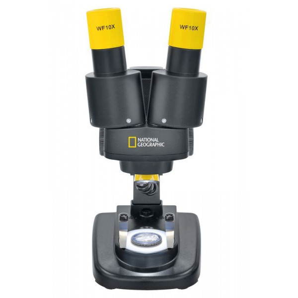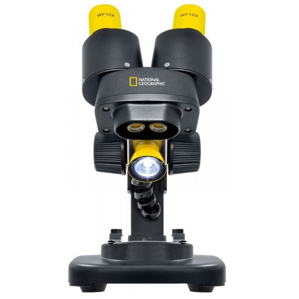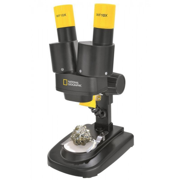 Спостерігати двома очима завжди краще, ніж одним. Мікроскоп National Geographic Stereo 20x дозволить спостерігати стереоскопічне збільшене в 20 разів зображення багатьох непрозорих та тривимірних об'єктів, які оточують нас. Не дивлячись на те, що це прилад початкового рівня - він цілком задовольнить запити тих, хто вивчає монети, займається нескладним ремонтом мікросхем, вивчає поверхневу структуру непрозорих тіл. У комплекті поставляється 12 зразків мінералів для вивчення. Завдяки бінокулярній конструкції, що створює об'ємне зображення, підсвічування світлом, що відбиває, і великій робочій відстані, за допомогою цього мікроскопа зручно спостерігати складові частини і деталі щодо великих зразків, таких як монети, марки, мінерали, мікросхеми і т д. Предметний столик обладнаний затискачами для утримання зразка, а також заглибленням зі знімним чорно-білим диском для спостереження зразків у розсіяному світлі. Окуляри зі змінною міжосьовою відстанню досить зручні для спостережень. Невелика вага та повна автономність від стаціонарних джерел живлення роблять цей мікроскоп дуже мобільним. Цей мікроскоп має хорошу скляну оптику, що дозволяє спостерігати досить якісну картинку і добре розрізняти дрібні деталі структури зразка, в чому ви зможете переконатися, розглядаючи мінерали, що постачаються в комплекті з мікроскопом. Опціонально мікроскоп можна забезпечити потужнішими окулярами, аксесуарами, джерелами світла і PC-микроокуляром.