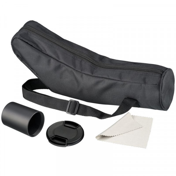Потовщене гумове покриття чорного кольору надійно захищає прилад від пошкоджень та забезпечує надійне захоплення підзорної труби рукою. Для максимального комфорту спостереження встановлений окуляр під кутом 45º. У комплект поставки входить настільний штатив-тренога для польових спостережень. Труба повертається в хомуті на 340 º для досягнення найбільш зручного кута спостережень. Для зручності транспортування та зберігання можна використовувати стійкий нейлоновий чохол на замку.