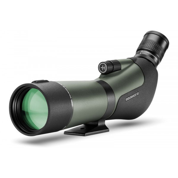 Окулярний вузол Hawke Endurance ED розташований під кутом 45º по відношенню до поздовжньої осі труби – це дуже зручно для спостережень у положенні лежачи та з настільних штативів. Корпус повертається навколо осі, встановлюється під будь-яким кутом і фіксується в кільці з розніманням для кріплення штатива. З цікавих рішень можна відзначити чіткі фіксовані положення труби при повороті навколо осі в точках 0, 45 і 90. Висувна сонцезахисна бленда захищає об'єктив від сонячних відблисків і від опадів. На захисній бленді знаходиться спеціальний цілік для попереднього наведення труби на ціль. Монтажна база труби адаптована під стандартне кріплення фотоштативу, тому пошук необхідної опори для спостереження - не проблема.