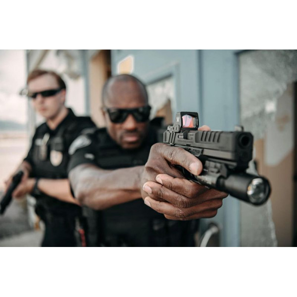 - Матовий чорний анодований корпус із низьким відблиском. Зносостійке анодування забезпечує матову поверхню з низьким відблиском і допомагає маскувати позицію стрільця.