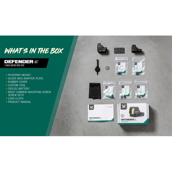 Приціл коліматорний Vortex Defender-ST 3 MOA Red Dot (DFST-MRD3) спеціально розроблено для сучасного щоденного носіння. Модель обладнана лінзою 23 х 20 мм, яка має тверде покриття, що забезпечує чітку передачу зображення без аберації. Автоувімкнення прицільної точки при виявленому руху зброї для швидкого реагування без зайвих рухів (дану функцію можна примусово вимкнути). Регулювання яскравості дозволяє знайти ідеальне налаштування для вашого ока, а функція блокування кнопок запобігає випадковим змінам під час носіння. Приціл сумісний з приладами нічного бачення, що розширює спектр його застосування. Тривалість роботи батарейки до 9500 годин та швидка заміна без необхідності переналаштування оптики.
