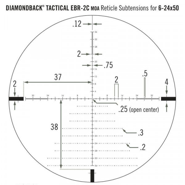 Оптичний приціл Vortex Diamonback Tactical 6-24x50 з прицільною маркою EBR-2C (в кутових хвилинах), розташованої у фокальній площині об'єктива.
