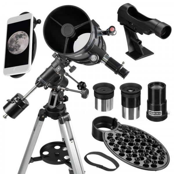 Ідеальне співвідношення якості, продуктивності та ціни - телескоп Bresser Pollux 150/1400 EQ3 Carbon з сонячним фільтром і адаптером для смартфона (4690900). Велика фокусна відстань забезпечує значне збільшення навіть зі штатними окулярами без використання лінзи Барлоу, а 150-мм апертура дозволяє досягти високої роздільної здатності та спостерігати навіть досить тьмяні об'єкти. Основними відмінностями від попередньої версії є посилена тринога, карбонове оздоблення труби LED-видошукач, сонячний фільтр та адаптер для камери смартфона в комплектації. За допомогою адаптера для смартфона, який іде в комплекті з телескопом, легко фотографувати об'єкти спостережень на вашому смартфоні. Опціонально телескоп може бути сполучений з PC-окуляром для запису та редагування зображень та відеороликів нічного неба. Телескоп Bresser Pollux 150/1400 EQ3 можна назвати одним з найкращих за поєднанням таких характеристик, як функціональність, якість, продуктивність, компактність та ціна. Особливо дана модель стала цікавою після включення в комплектацію апертурного сонячного фільтра, що значно розширює можливості приладу. Особливості оптичної системи дозволили отримати значну фокусну відстань при невеликих розмірах оптичної труби, зробити прилад менш схильним до впливів вітру, а також зберегти зручне для спостереження бічне розташування фокусера з окуляром. Велика апертура дозволяє зібрати достатньо світла практично для будь-яких спостережень, які може забезпечити аматорський прилад. Велика фокусна відстань телескопа дає можливість отримати пристойне збільшення, використовуючи при цьому фокусні, якісні окуляри. Лінза Барлоу покликана при необхідності потроїти кратність телескопа. Телескоп укомплектований двома окулярами з фокусною відстанню 4 мм та 20 мм, що дозволяє при необхідності отримати як велике збільшення, так і значне поле зору. LED видошукач з точковим наведенням помітно полегшить наведення приладу на об'єкт, що цікавить не тільки вночі, але і вдень, а екваторіальне монтування телескопа дозволить легко здійснювати спостереження за добовим рухом об'єктів по небосхилу і займатися астрофотографією. Набір аксесуарів полегшить спостереження та зробить їх більш цікавими та докладними. У комплектацію входить адаптер для смартфона (планшета). Адаптер кріпиться на вибраному окулярі і дозволяє проводити фото та відеозйомку головною або передньою камерою гаджета. Гладка тильна сторона смартфона надійно кріпиться за допомогою безлічі присосок адаптера (у разі рифленої тильної поверхні смартфона рекомендується використовувати передню камеру). Найчастіше в умовах міста ми не можемо досягти таких високоякісних зображень нічного неба, як нам би того хотілося. Компактні розміри телескопа максимально спростять транспортування, що забезпечить незабутні враження спостережень космосу за межами міста.