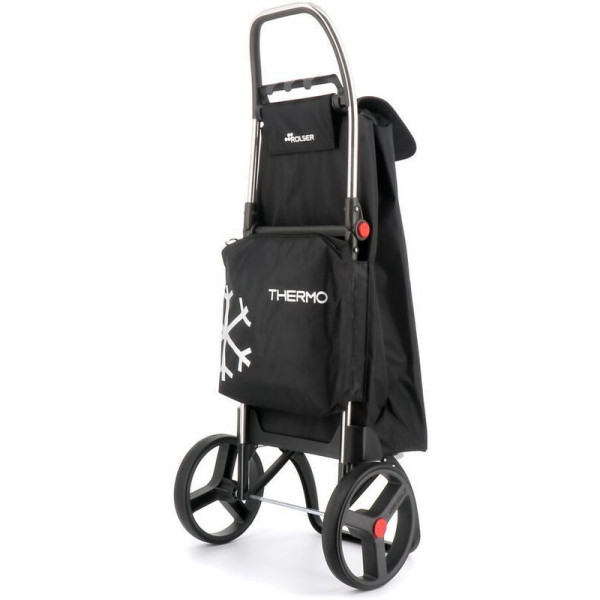 Сумка-візок Rolser I-Max Termo Zen 2LRSG Negro (IMX356-1023) - надійний помічник при поході за продуктами до супермаркету чи на ринок. Особливістю даної моделі є наявність термокишені на чотири літри для заморожених продуктів або охолоджених напоїв. Алюмінієва конструкція візка дозволяє транспортувати вантаж максимальною вагою до 40 кг. Рама 2LRSG має систему для повного складання, а також оснащена адаптером для з’єднання з візком супермаркету. Розкладна основа виконана з алюмінію, а опора - з міцного термостійкого пластику. Внутрішня частина рукоятки має пластикове покриття для комфортного транспортування сумки-візка в холодну пору року. Міцний поліестеровий матеріал сумки захистить вміст від дощу та снігу. Знімна сумка, має зручну широку горловину, яка стягується шнуром з фіксатором. Верх сумки накритий захисним клапаном. На дні сумки передбачене вставне дно із пластику.