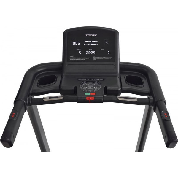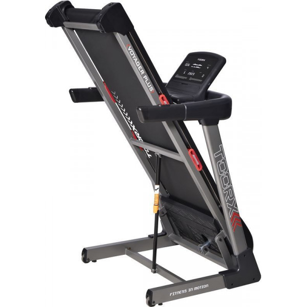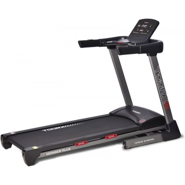 Бігова доріжка Toorx Treadmill Voyager Plus (VOYAGER-PLUS) від італійського виробника Garlando S.p.A. призначена для спортивної ходьби та бігу в домашніх умовах. Модель розрахована на максимальну вагу користувача до 120 кг і має потужний двигун постійного струму 3 к.с., який дозволяє розвивати швидкість від 1 до 20 км/год. Бігове полотно розміром 141 х 48 см із можливістю регулювання нахилу від 0 до 15% як кнопками на панелі керування, так і за допомогою кнопок, розташованих на поручнях. Система амортизації Soft Tech знижує навантаження на суглоби та мінімізує ризик отримання травми в процесі занять. Консоль тренажера з LED-дисплеєм оснащена різноманітними програмами як для підготовлених користувачів, так і для початківців. Бездротовий датчик вимірювання пульсу буде доречним під час тренування по одній із чотирьох пульсозалежних програм. Бігова доріжка Toorx Treadmill Voyager Plus (VOYAGER-PLUS) має складану конструкцію та транспортувальні ролики, завдяки чому її легко переміщати по квартирі.
