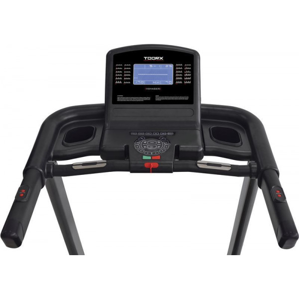 Бігова доріжка Toorx Treadmill Voyager (VOYAGER) від італійського виробника Garlando S.p.A. призначена для спортивної ходьби та бігу в домашніх умовах. Модель розрахована на максимальну вагу користувача до 120 кг і має потужний двигун постійного струму 2,75 к.с., який дозволяє розвивати швидкість від 1 до 18 км/год. Бігове полотно розміром 141 х 48 см із можливістю регулювання нахилу від 0 до 15% як кнопками на панелі керування, так і за допомогою кнопок, розташованих на поручнях. Система амортизації Soft Tech знижує навантаження на суглоби та мінімізує ризик отримання травми в процесі занять. Консоль тренажера з LCD-дисплеєм із блакитним підсвічуванням оснащена різноманітними програмами як для підготовлених користувачів, так і для початківців. Вбудовані сенсорні датчики вимірювання пульсу будуть доречними під час тренування по одній із чотирьох пульсозалежних програм. Бігова доріжка Toorx Treadmill Voyager (VOYAGER) має складану конструкцію та транспортувальні ролики, завдяки чому її легко переміщати по квартирі.