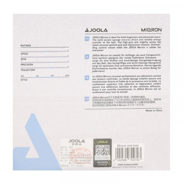 Joola Micron має дрібнопористу фіолетову губку з чудовими властивостями демпфера і тому набирає бали з особливо високими показниками контролю. Верхня гума забезпечує оптимальне зчеплення у будь-який час і дозволяє грати із сильним обертанням. Без вбудованого ефекту швидкого клею та з навмисно зниженими властивостями катапульти, накладка дуже популярна серед гравців, які віддають перевагу класичним накладкам.