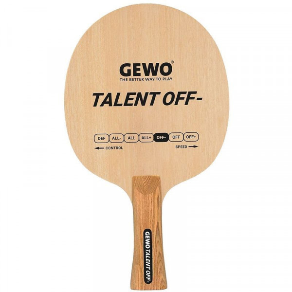 Щоб надати молодим талантам найкращий матеріал із самого початку, спеціалісти GEWO інтенсивно працювали над оптимізацією основ для ракеток. Результатом стали нові моделі Talent ALL і Talent OFF. Особливу увагу було приділено формуванню зручних ручок, які були адаптовані до пропорцій рук молодих гравців з точки зору міцності, товщини та довжини. Лицьова частина ракетки адаптована до її розміру для досягнення ідеального розподілу ваги. Мала вага приблизно 75 г забезпечується ретельним підбором шпону різних порід дерева. Основа для ракетки Gewo Talent OFF- додає лезу гостроти та чистого зворотного зв’язку завдяки використанню в верхньому шарі шпону Koto. Внутрішній шар шпона із дерева Kiri забезпечує більше прискорення, що ідеально підходить для просунутих талантів. Це лезо ідеально підходить для поєднання з більш сучасними, швидшими гумами. Таким чином, у нього можна грати протягом тривалого часу та адаптуватися до більшого рівня продуктивності.