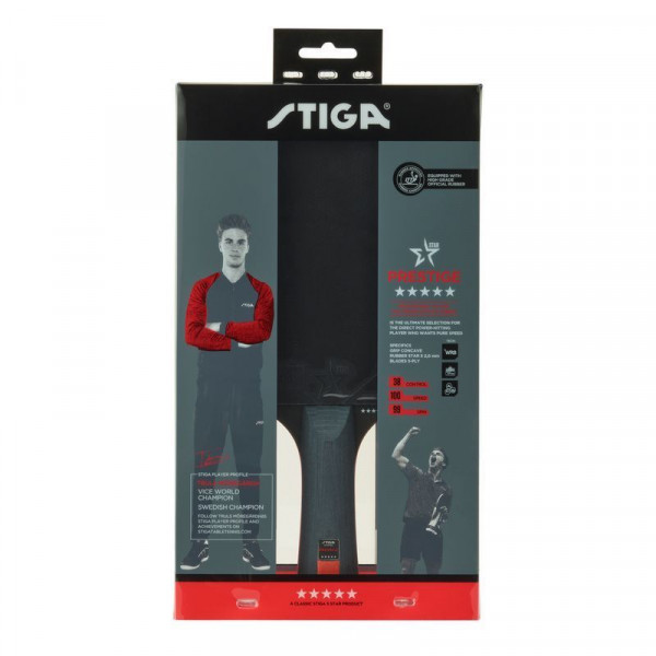 Ракетка для настільного тенісу Stiga Prestige - це п'ятизіркова швидкісна ракетка найвищої якості, розроблена виключно для потужних атакувальних гравців зі швидким і жорстким стилем гри. Завдяки гумі Star 5 - 2.00 мм, ракетка збільшує силу удару і швидкість удару по м'ячу. Ракетка має чудові технології від майстерні Stiga: WRB, ACS і Crystal Technology. Ракетка сертифікована Міжнародною федерацією настільного тенісу ITTF.