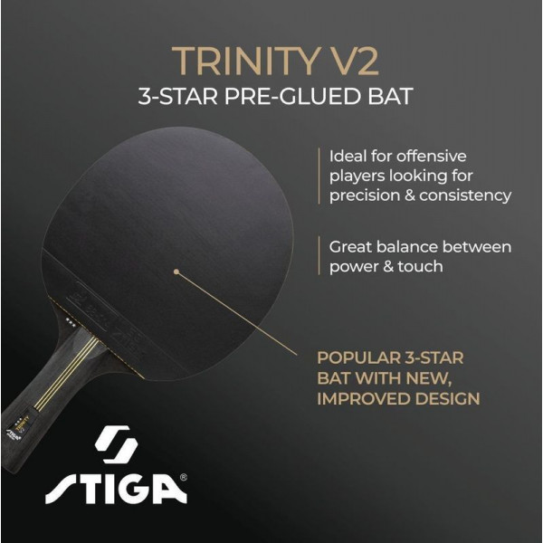 Ракетка Stiga Trinity V2 — це нова та вдосконалена версія популярної ракетки для настільного тенісу Trinity 3-Star, спеціально розробленої для гравців у нападі, які хочуть поєднати швидкість, контроль та точність у своїй грі. Завдяки міцній конструкції та майстерно розробленим функціям, ця ракетка для настільного тенісу підніме вашу гру на новий рівень, як на тренуваннях, так і на змаганнях. Потужна основа виготовленаз п'яти ретельно відібраних шарів деревини, що забезпечує як стабільність, так і вибухову реакцію з кожним ударом. Результатом є ракетка для настільного тенісу, яка дає вам силу, необхідну для домінування в грі за допомогою жорстких, точних атак. Гума найвищої якості, схвалена ITTF, пропонує оптимальне обертання та контроль — ідеально підходить для тих, хто хоче надавати м'ячу обертання та впевнено контролювати гру. Ергономічна увігнута ручка зручно лежить у руці навіть під час тривалих, напружених матчів, забезпечуючи комфорт та міцний хват аж до матч-пойнта. Розроблена у тісній співпраці з гравцями збірної Китаю, Trinity V2 базується на тих самих передових технологіях, що й професійні основи ракеток Stiga, що надає вам доступ до знань аж до найдрібніших деталей. На додачу до всього, ракетка постачається в екологічно чистій упаковці, що підлягає переробленню — свідомий вибір для тих, хто хоче грати стильно та дбайливо. Оберіть Stiga Trinity V2 та зробіть наступний крок у своїй кар'єрі в настільному тенісі з ракеткою, яка поєднує професійну продуктивність та продуманий дизайн.