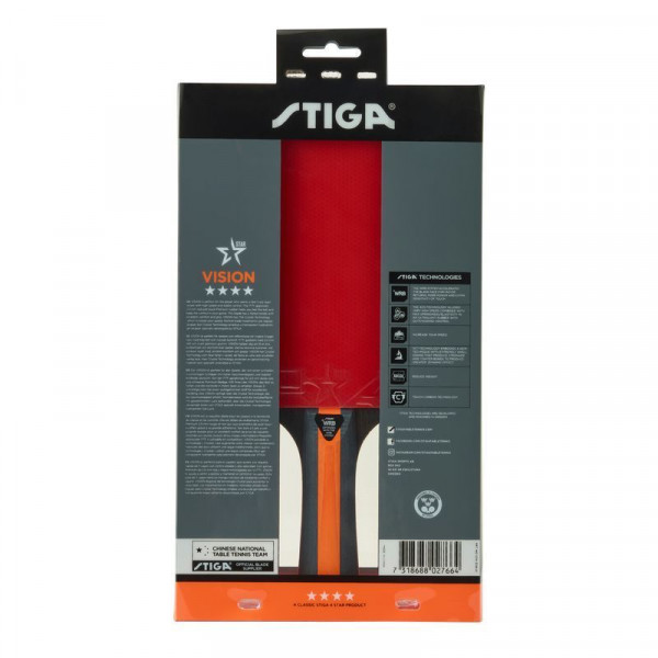 Ракетка для настільного тенісу Stiga Vision розроблена для просунутих і досвідчених гравців з атакувальним стилем гри, яким потрібно більше відчуття і контроль над м'ячем під час атак і контратак. Ракетка оснащена гумою Star 4 - 2,00 мм, передовою технологією виробництва гуми Stiga ACS і полегшеною ручкою Stiga WRB. Ракетка сертифікована Міжнародною федерацією настільного тенісу ITTF.