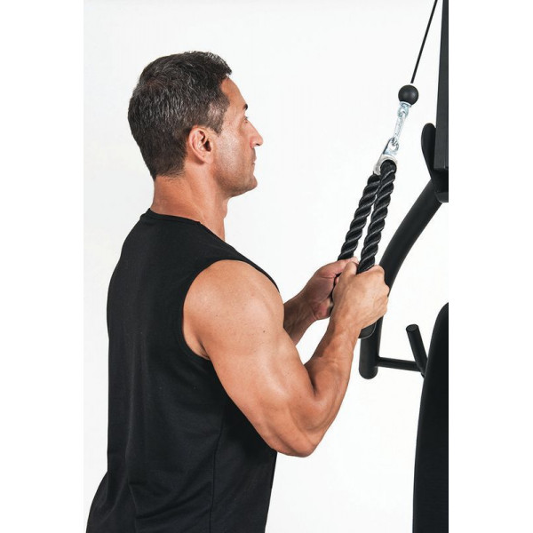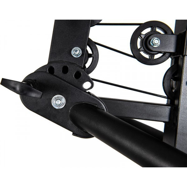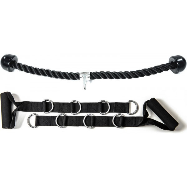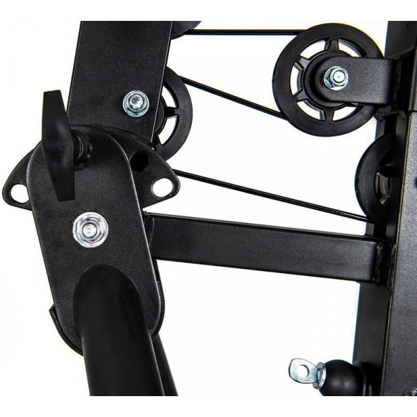 - В комплекті широка ручка для тяги, пряма ручка для тяги, канатна ручка для тяги, дві регульовані ручки для тяги, лямка для ноги.
