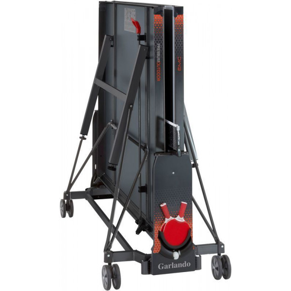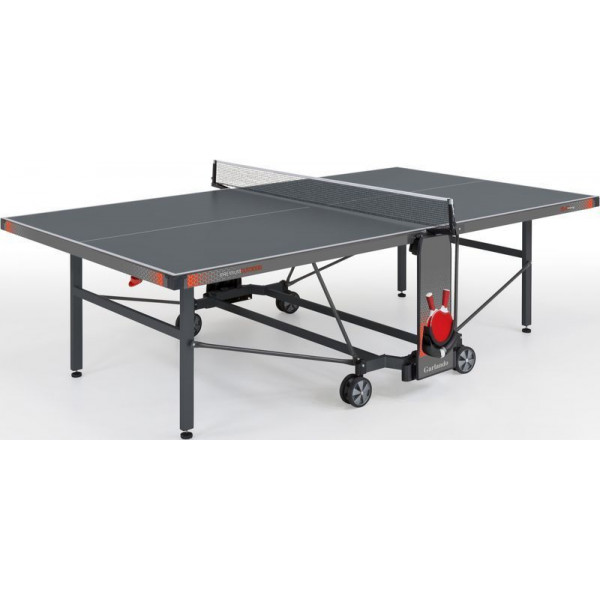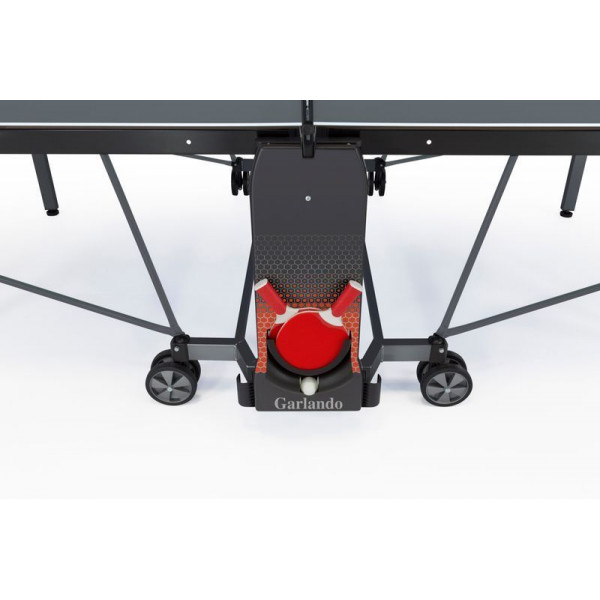 Garlando Premium Outdoor 6 mm Grey (C-570E) - всепогодний тенісний стіл, призначений для гри в настільний теніс як на вулиці, так і в закритих приміщеннях. Ігрова поверхня виконана з меламінових плит товщиною 6 мм із металевою крайкою по периметру. Модель надзвичайно стійка, завдяки конструкції з ніжками з металевих трубок 50х30 мм і горизонтальним з’єднувальним планкам. Чотири здвоєні транспортувальні колеса діаметром 128 мм обертаються на 360°, що суттєво полегшує переміщення столу за потреби. Тенісний стіл оснащений сіткою та тримачем для ракеток і м'ячів. Компактний пристрій автоматичного закривання мінімізує обтяження після того, як настільний стіл складено, а система ECS дозволяє розблокувати стільниці одним рухом максимально швидко та безпечно. Складана конструкція з автоматичною системою блокування забезпечує зручне зберігання столу в домашніх умовах. Піднявши одну з половинок стільниці, тенісний стіл можна використовувати як для одиночних тренувань, так і для гри людьми з обмеженими можливостями. Стільниця забезпечує хороший відскік м'яча, а покриття антивідблиску дозволяє грати довше, не напружуючи очей. Тенісний стіл Garlando Premium Outdoor 6 mm Grey (C-570E) відповідає Європейським стандартам безпеки EN 14468-1/2, рекомендований для інтенсивного використання в школах і клубах.