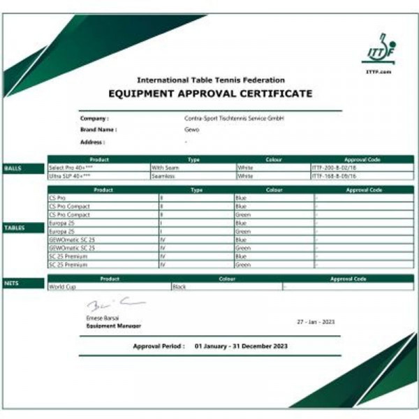 Тенісний стіл сертифікований Міжнародною федерацією настільного тенісу (ITTF) для гри на офіційних змаганнях