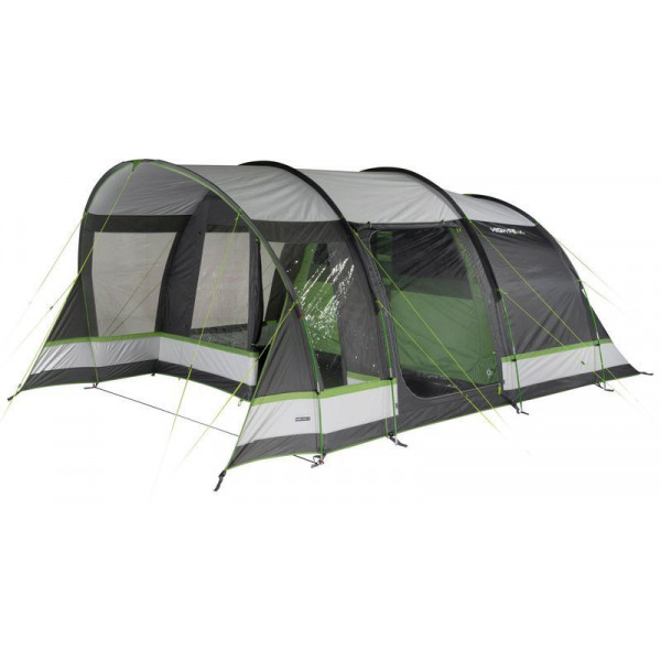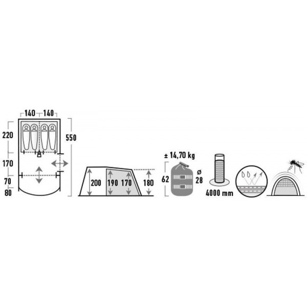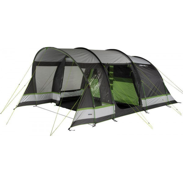 High Peak Garda 4.0 Light Grey/Dark Grey/Green (11821) - чотиримісний тунельний намет із двома входами, вітальнею зі вшитою підлогою, що забезпечує захист від настирливих комах та небажаних протягів. Великий інтегрований навіс із прозорими вікнами створює тінь і допомагає запобігти попаданню дощу всередину під час відчинення дверей. Передню стінку можна згорнути, щоб збільшити корисну площу намету. Житлова зона з висотою стелі 2 м дозволяє стояти на повний зріст, а також має достатньо місця для розміщення кемпінгових стільців, столу та похідного спорядження. Передні сітчасті двері з клапаном на блискавці забезпечують постійний приплив свіжого повітря в намет. Бічні сітчасті двері збільшують приплив свіжого повітря і захищають від комах. Прозорі вікна у житловій зоні наповнять приміщення світлом, а штори за необхідності забезпечать усамітнення. Дах має тепловідбивне алюмінізоване покриття, що знижує підвищення температури всередині намету вдень у сонячну погоду.