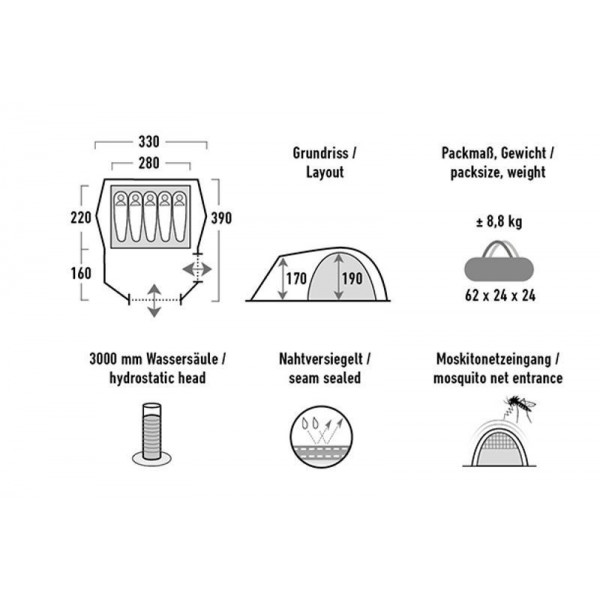 High Peak Tessin 5.1 Deep Forest (10381) - п'ятимісний купольний намет із просторим тунельним тамбуром і додатковим бічним входом. Модель має алюмінізоване покриття зовнішнього тенту, яке зміцнює тканину та знижує підвищення температури всередині в сонячну погоду. Намет оснащений екологічно чистим водовідштовхувальним DWR-просоченням без PFC елементів. Дві високоефективні системи вентиляції Advanced Low Vent System забезпечують оптимальну циркуляцію повітря навіть у дощові дні. Достатня відстань між внутрішнім наметом і зовнішнім тентом суттєво зменшує утворення конденсату. Затемнена спальня не пропускає яскраве світло, дозволяючи виспатися всім, хто пізно прокидається. Система вентиляції внутрішнього намету Vario Vent Control забезпечує регульований потік свіжого повітря, щоб ви могли виспатися ще краще. Всі шви дна і тенту проклеєні спеціальною стрічкою, гарантуючи захист від проникнення вологи в дощову погоду. В наметі зможуть без проблем розміститися четверо-п'ять людей із усім спорядженням. Намет п'ятимісний High Peak Tessin 5.1 Deep Forest (10381) стане чудовим вибором для комфортного сімейного відпочинку протягом вихідних.