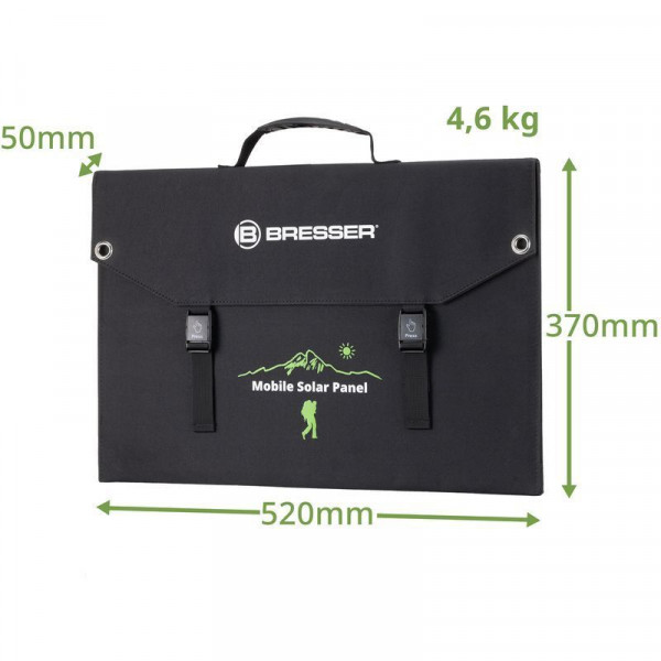 Портативний сонячний зарядний пристрій Bresser Mobile Solar Charger 120 Watt призначений швидко заряджати смартфони, планшети, ноутбуки та зовнішні акумуляторні батареї. Інноваційна технологія сонячних батарей, на основі монокристалічних кремнієвих елементів, забезпечує високу ефективність та максимально швидку зарядку різних акумуляторів. Міцна та надійна тканина Cordura захищає сонячну панель від механічних пошкоджень та забезпечує необхідну стабільність під час використання. Сонячна панель має додатковий захист завдяки застосуванню при виготовленні пило- та водовідштовхувальних матеріалів, але не розрахована на використання під проливним дощем або зануренню безпосередньо у воду. Для надійної фіксації панелі до об'єкту (палатка, автомобіль, рюкзак, дерево), в комплект поставки входять 4 карабіни.