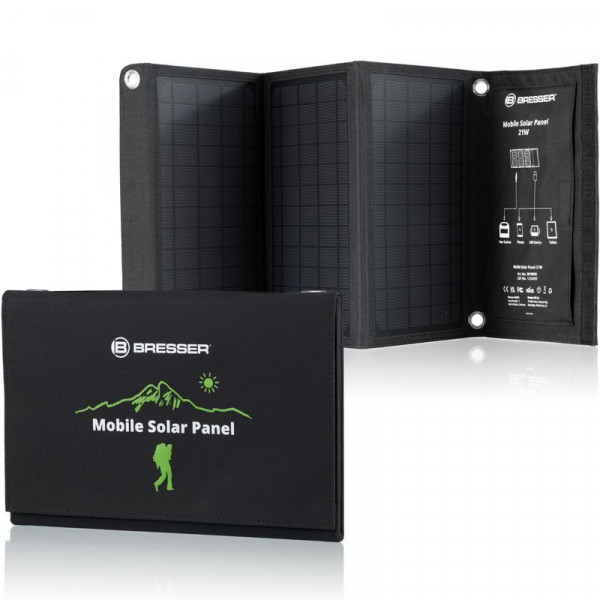 Портативний сонячний зарядний пристрій Bresser Mobile Solar Charger 21 Watt призначений швидко заряджати смартфони, планшети, павербанки. Інноваційна технологія сонячних батарей, на основі монокристалічних кремнієвих елементів, забезпечує високу ефективність та максимально швидку зарядку різних акумуляторів. Міцна та надійна тканина Cordura захищає сонячну панель від механічних пошкоджень та забезпечує необхідну стабільність під час використання. Сонячна панель має додатковий захист завдяки застосуванню при виготовленні пило- та водовідштовхувальних матеріалів, але не розрахована на використання під проливним дощем або зануренню безпосередньо у воду. Для надійної фіксації панелі до об'єкту (палатка, автомобіль, рюкзак, дерево), в комплект поставки входять 2 міцні карабіни.