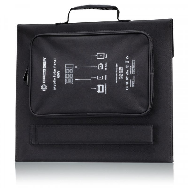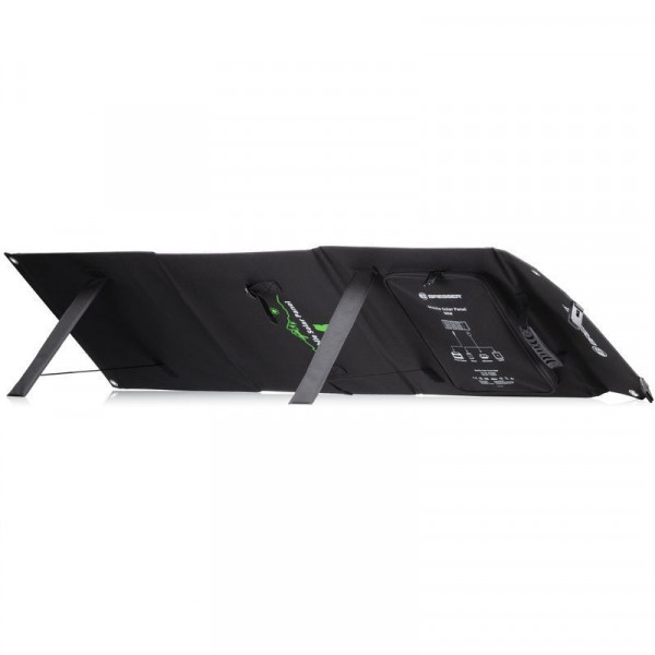 Портативний сонячний зарядний пристрій Bresser Mobile Solar Charger 60 Watt призначений швидко заряджати смартфони, планшети, ноутбуки та зовнішні акумуляторні батареї. Інноваційна технологія сонячних батарей, на основі монокристалічних кремнієвих елементів, забезпечує високу ефективність та максимально швидку зарядку різних акумуляторів. Міцна та надійна тканина Cordura захищає сонячну панель від механічних пошкоджень та забезпечує необхідну стабільність під час використання. Сонячна панель має додатковий захист завдяки застосуванню при виготовленні пило- та водовідштовхувальних матеріалів, але не розрахована на використання під проливним дощем або зануренню безпосередньо у воду. Для надійної фіксації панелі до об'єкту (палатка, автомобіль, рюкзак, дерево), в комплект поставки входять 4 міцні карабіни.