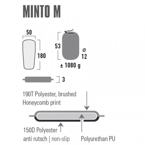 High Peak Minto M 3 cm Black (41115) - самонадувний туристичний килимок товщиною 3 см, з наповнювачем із поліуретанової піни високої густини, що забезпечує чудову ізоляцію та комфорт під час сну. Верх із перфорацією Wave Cut ідеально прилягає до тіла та сприяє легкому складанню. Форма трапеції відрізняється простотою використання та економією ваги. Верх килимка виготовлений із високоякісної нековзної та приємної для шкіри матової тканини із поліестеру 190T зі стильним принтом у вигляді сот, а низ - із міцного нековзного поліестеру 150D. High Peak Minto M 3 cm Black (41115) оснащений високоякісним клапаном, який миттєво всмоктує повітря, заповнюючи піну для швидкого використання. При складанні килимка повітря виходить швидше, що значно полегшує згортання. Килимок поставляється з двома компресійними ременями та чохлом для зберігання.