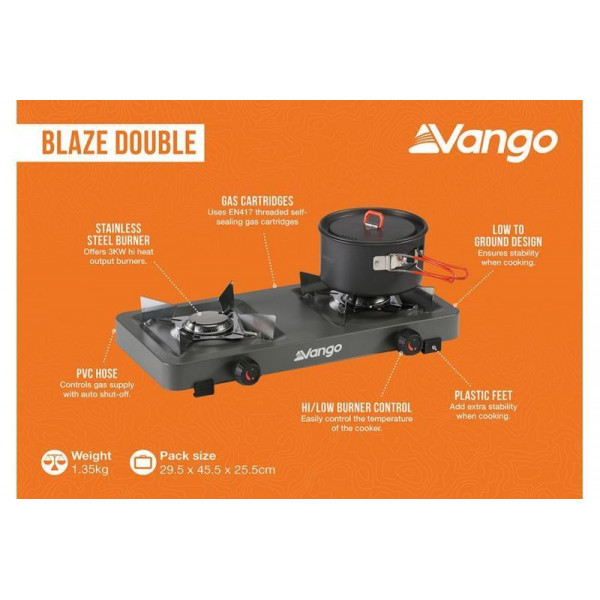 Портативна газова плитка Vango Blaze Double Grey (ACPBLAZE G10A81) має дві конфорки із нержавіючої сталі, які забезпечують чудову тепловіддачу, що дозволяє швидко та ефективно готувати на відкритому повітрі. Vango Blaze Double легко очищається, а низька конструкція в поєднанні з протиковзкими ніжками забезпечує її достатню стійкість. Плитка включає ПВХ шланг із автоматичним відключенням для безпеки та має використовуватися з газовими балонами, які відповідають європейському стандарту EN417. Дана модель ідеально підходить для пікніків, кемпінгу та всіх видів активного відпочинку.