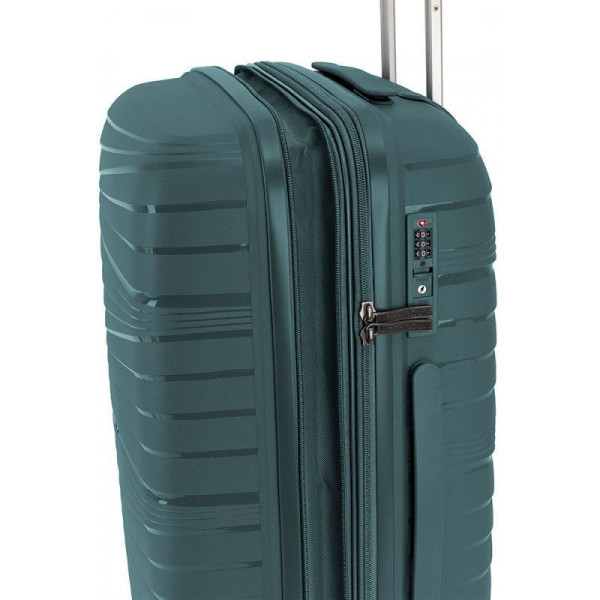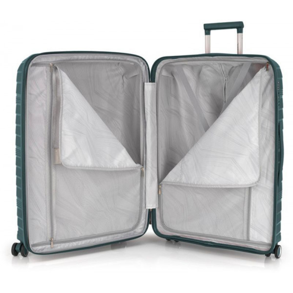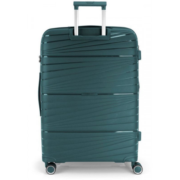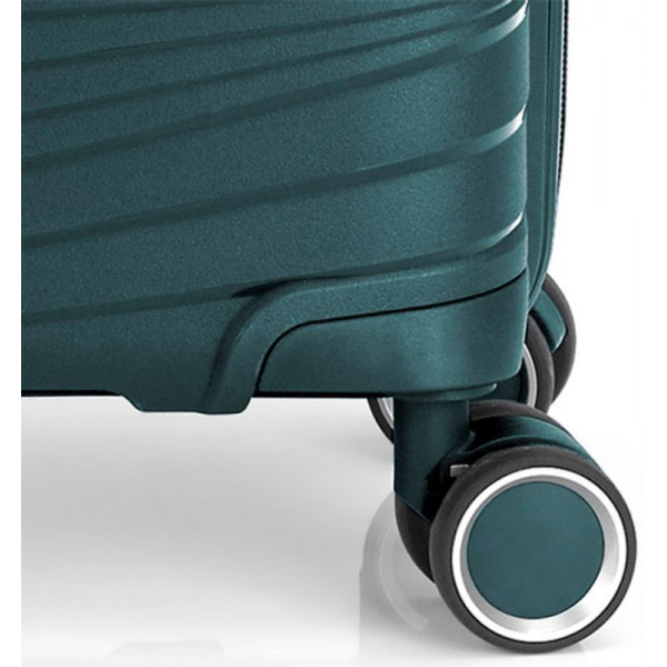 Валіза Gabol Kiba (L) Verde (122047-004) оснащена чотирма повноповоротними колесами з можливістю незалежного розвороту кожного колеса на 360°. Системою передбачено рівномірний перерозподіл навантаження на кожне колесо, що у свою чергу сприяє плавному руху та маневреності валізи, докладаючи при цьому мінімум зусиль. Колеса виготовлені із високотемпературного термопластичного поліуретану (TPU). Матеріал має міцність порівнянну з пластиком, гнучкістю силікону, а також має підвищену стійкість до перепадів температур. Відмінною особливістю коліс із TPU матеріалу є зниження шуму до мінімуму під час руху валізи по нерівній поверхні. Завдяки стійкості до стирання матеріал коліс відрізняється тривалим терміном експлуатації.