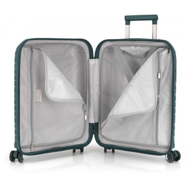 Корпус валіз Gabol серії Kiba виконаний з міцного та довговічного матеріалу - поліпропілену, що дуже важливо для валіз які перевозяться в багажних відділеннях. Внутрішній об'єм розділений перегородкою на два відділення та має ремені для фіксації речей усередині.