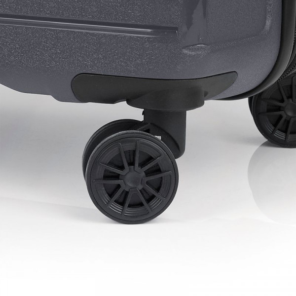 Валіза Gabol Osaka (S) Grey (121022-016) оснащена чотирма здвоєними колесами з можливістю розвороту на 360°. Конструкція забезпечує рівномірний перерозподіл навантаження на кожне колесо, що сприяє плавному руху та маневреності валізи. Колеса виготовлені з термопластичного поліуретану (TPU). Цей матеріал має міцність порівнянну з пластиком, гнучкістю силікону, а також підвищену стійкість до перепадів температури та стирання. Завдяки цьому колеса мають тривалий термін експлуатації. Також відмінною особливістю коліс із TPU матеріалу є зниження шуму до мінімуму під час руху валізи нерівною поверхнею.