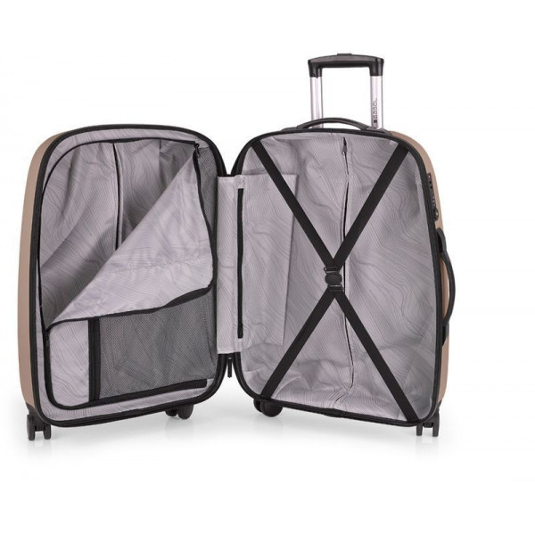 Корпус валіз Gabol серії Paradise XP виконаний з легкого та водночас міцного матеріалу ABS - термопластичний листовий конструкційний матеріал, який має підвищену ударостійкість і пружність, що дуже важливо для валіз які перевозяться в багажних відділеннях. Внутрішній простір розділений перегородкою на два відділення, яка має сітчасту кишеню на блискавці, додатково є кишеня для документів або різних дрібниць. Валіза обладнана розширювальним клапаном, який за необхідності дозволяє збільшити об'єм до 79 літрів.