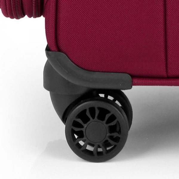 Валіза Gabol (S) Burgundy (113401-026) має чотири повноповоротних колеса з можливістю незалежного розвороту кожного на 360°. Конструкція забезпечує рівномірний перерозподіл навантаження на кожне колесо, що сприяє плавному руху та маневреності валізи. Колеса виготовлені з термопластичного поліуретану (TPU). Матеріал має міцність порівнянну з пластиком, гнучкістю силікону, а також має підвищену стійкість до перепадів температур. Завдяки цьому колеса мають тривалий термін експлуатації. Відмінною особливістю коліс із TPU-матеріалу є зниження шуму до мінімуму під час руху валізи нерівною поверхнею.