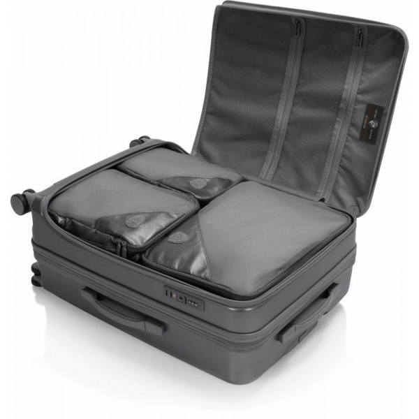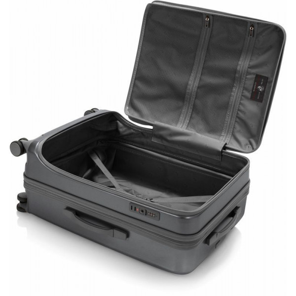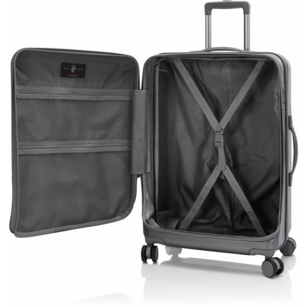 Валіза Heys EZ Fashion (M) Charcoal (10162-0047-26) на відміну від традиційної конструкції з розділенням 50/50, яка зустрічається в більшості жорстких валіз, відрізняється системою відкривання спереду. Це дає можливість пакування речей вглибину, використовуючи передній клапан. Виготовлена з полікарбонатного композиту: легкого, міцного та ударостійкого матеріалу. Зовнішня поверхня має легке тиснення, що запобігає появі подряпин й потертостей. Внутрішня частина повністю на підкладці. Основне відділення має два еластичні ремені для фіксації речей, що закріплюються застібкою. Також є дві сітчасті кишені для зберігання необхідних дрібниць. Є можливість збільшити корисний об єм валізи до 20% завдяки наявності розширювального клапана.