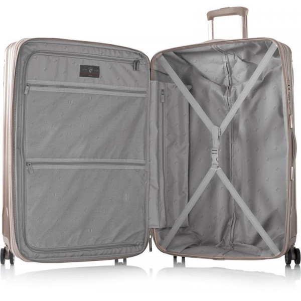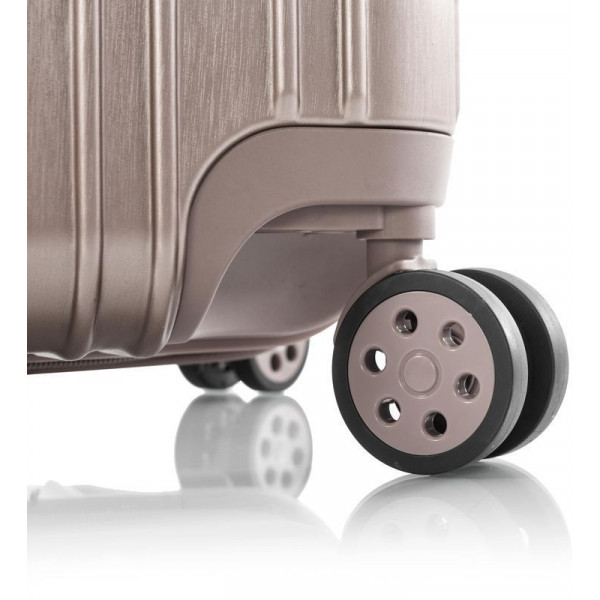 Основне відділення має розділювач на блискавці з двома сітчастими кишенями та два еластичні ремені для фіксації речей, що закріплюються застібкою. Валіза обладнана фірмовим кодовим замком з функцією митного огляду TSA та чотирма спареними повно поворотними колесами з можливістю незалежного розвороту кожного колеса на 360°. Системою передбачено рівномірний перерозподіл навантаження на кожне колесо, що своєю чергою сприяє плавному коченню та маневровості валізи. Є можливість збільшити корисний об єм валізи до 20% завдяки наявності розширювального клапана.