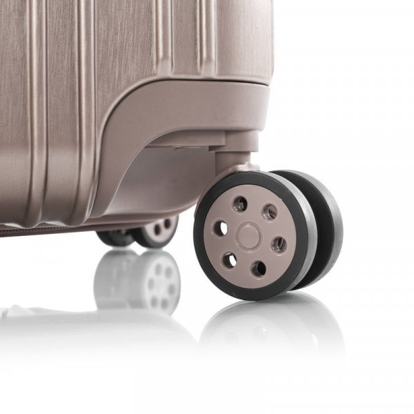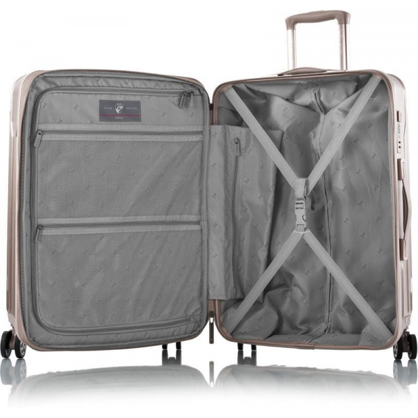 Основне відділення має розділювач на блискавці з двома сітчастими кишенями та два еластичні ремені для фіксації речей, що закріплюються застібкою. Валіза обладнана фірмовим кодовим замком з функцією митного огляду TSA та чотирма спареними повно поворотними колесами з можливістю незалежного розвороту кожного колеса на 360°. Системою передбачено рівномірний перерозподіл навантаження на кожне колесо, що своєю чергою сприяє плавному коченню та маневровості валізи. Є можливість збільшити корисний об єм валізи до 20% завдяки наявності розширювального клапана.