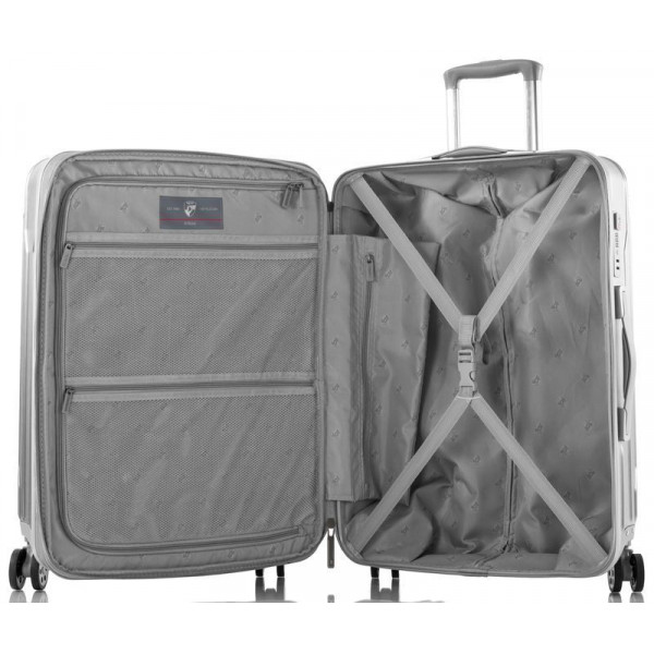 Основне відділення має розділювач на блискавці з двома сітчастими кишенями та два еластичні ремені для фіксації речей, що закріплюються застібкою. Валіза обладнана фірмовим кодовим замком з функцією митного огляду TSA та чотирма спареними повно поворотними колесами з можливістю незалежного розвороту кожного колеса на 360°. Системою передбачено рівномірний перерозподіл навантаження на кожне колесо, що своєю чергою сприяє плавному коченню та маневровості валізи. Є можливість збільшити корисний об єм валізи до 20% завдяки наявності розширювального клапана.
