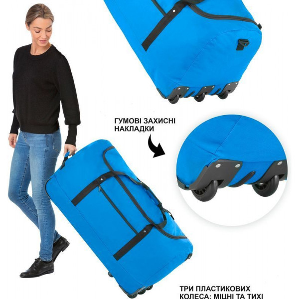 Класична дорожня сумка на колесах TravelZ Wheelbag 100 Liter Blue (603093) практична, легка та забезпечує необхідний функціонал для вашої зручності. Сумка виготовлена з міцного водонепроникного поліестеру 600 D. Рекомендоване навантаження до п'ятнадцяти кілограмів. Одне основне відділення на блискавці. Додаткова кишеня на блискавці на лицьовій поверхні сумки. Бокова ручка для переміщення на колесах. Три вбудовані колеса. На дно нанесені захисні гумові ковпачки, а також додаткова захисна гума на тканині. Переносити сумку можливо за допомогою ручок зверху або ременя на плечі. Після використання сумка TravelZ Wheelbag 100 Liter Grey (603092) складається в зручний чохол і набуває компактного розміру (37 х 17 х 17 см).