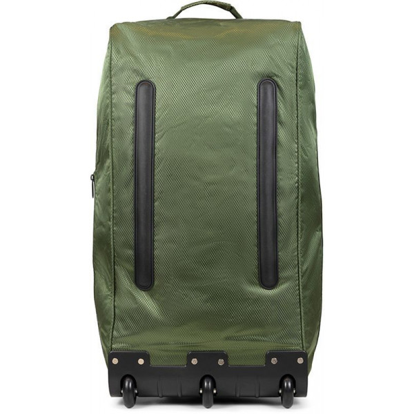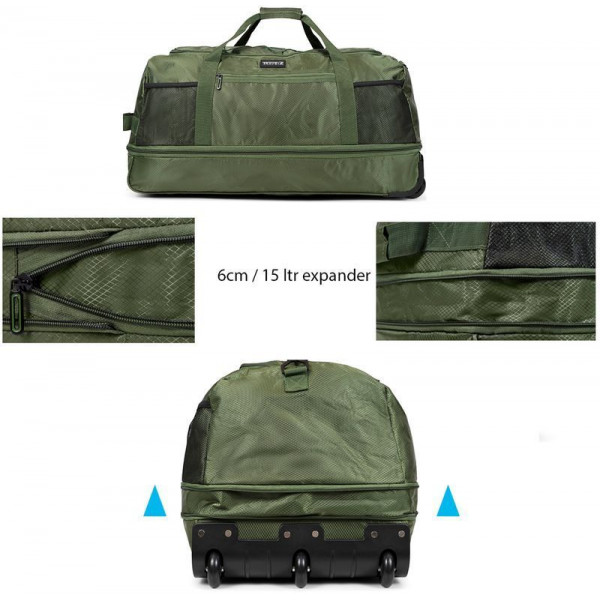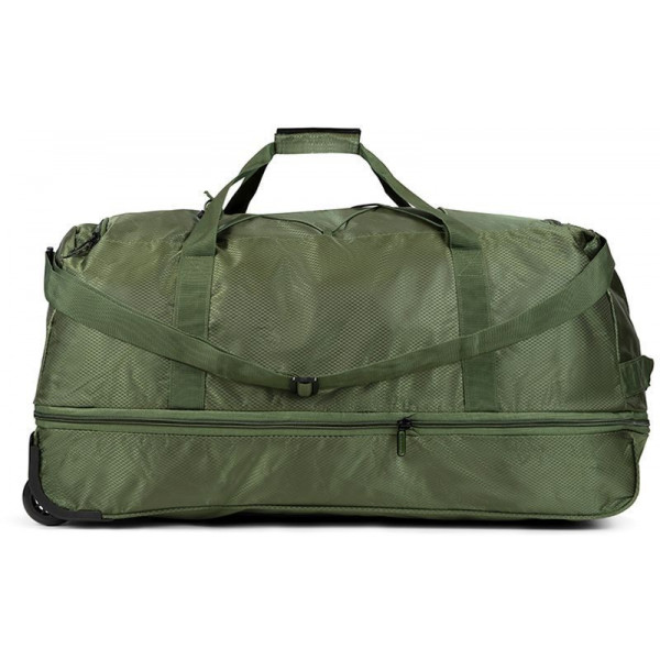 Сумка дорожня на колесах TravelZ Wheelbag Doubleloader foldable green 80(95)L (603097) – має такий же об єм, як валіза середнього розміру. Ви можете легко збільшити об'єм з 80 до 95 літрів за допомогою розширювача на блискавці. Цю дорожню сумку можна зберігати в компактній упаковці розміром 37 x 38 x 12 см, щоб заощадити місце. Колеса сумки розміщені в міцній кутовій конструкції, але дно сумки м яке. Дві гумові смужки на дні сумки забезпечують захист під час використання сумки. Максимальне навантаження до 15 кг. Зверніть увагу, що ця сумка буде зручною для людей зростом до 175 см.